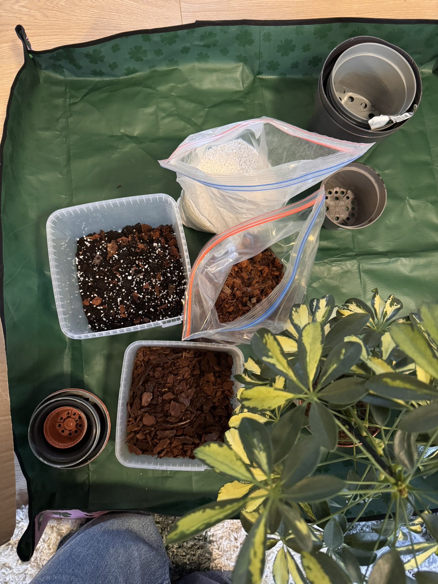 I keep things pretty organized. I have a container for orchid bark, a bag of coco coir, and a bag of perlite. Then I use a separate container to mix the actual soilโin this case, my Dwarf Umbrella mix.